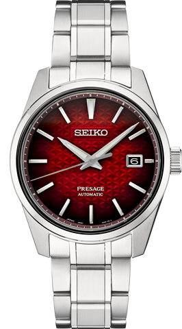 Presage Sharp-Edged Series Fine mechanical watchmaking from Japan Automatic with manual winding capability Gradated red dial with date calendar and uniquely shaped LumiBrite hands and stick markers Screwdown crown and see-through caseback See-through caseback Presage embraces the fresh look of contemporary Japanese design with this coolly angular timepiece The theme of energy is captured by the intricate dial pattern, based on the traditional Asanoha hemp leaf motif of the Heian Period (794-1185 AD), a symbol of growth and prosperity