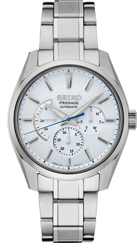 Presage Sharp-Edged Series Contemporary angular case design Fine mechanical watchmaking from Japan Automatic with manual winding capability Power reserve indicator Day and date subdials LumiBrite hands and markers Screwdown see-through caseback Tri-fold push button release clasp Patterned light blue dial with the Sharp-Edged Series Asanoha hemp leaf motif and gloss finish