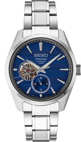 Presage Sharp Edged Series Contemporary angular case design Fine mechanical watchmaking from Japan Automatic with manual winding capability Patterned gradated deep blue dial with the Sharp Edged Series Asanoha hemp leaf motif and gloss finish Open aperture incorporating the hemp leaf motif 24-hour subdial LumiBrite hands Screwdown see-through caseback Tri-fold push button release clasp