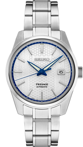 Presage Sharp-Edged Series GMT Limited Edition Limited edition of 2,000 Contemporary angular case design Fine mechanical watchmaking from Japan Automatic with manual winding capability Date calendar LumiBrite hands and markers Screwdown see-through caseback with Zero Halliburton logo Tri-fold push button release clasp Packaged in a Limited Edition collectors' case Designed in collaboration with the iconic Zero Halliburton luggage brand Patterned silver dial with blue accents combining the Zero Halliburton double-rib design and the Sharp-Edged series Asanoha hemp leaf motif