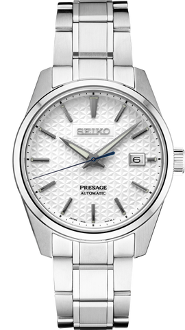Presage Sharp-Edged Series Contemporary angular case design LumiBrite hands and markers Automatic with manual winding capability Date calendar Tri-fold push button release clasp See-through caseback Patterned white dial evoking the traditional hemp leaf motif of the Heian Period