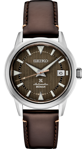 1959 Sport Watch Re-interpretation. Designed for those who treat life as the ultimate adventure, the Seiko Prospex line meets every challenge with technological excellence and style. This extraordinary timepiece re-interprets the watch that launched a rich legacy of over 60 years of sports watch excellence. Styled to fit contemporary tastes while evoking a vintage feel, this exceptional watch is as smooth and refined as the prized 1959 version, but far more powerful. The rich brown dial includes the original's mountain-shaped markers at 12, 6 and 9, ensuring legibility while referring to its mountaineering inspiration, as well as LumiBrite hands and markers, a date calendar and a curved sapphire crystal with anti-reflective coating on the inner surface. The screwdown see-through caseback provides a view of the 24-jewel automatic movement, which beats at a frequency of 21,600 vibrations per hour, with a power reserve of approximately 70 hours, and offers manual winding capability. In stainless steel, with a brown cordovan strap. 20 bar, 200M Water Resistant