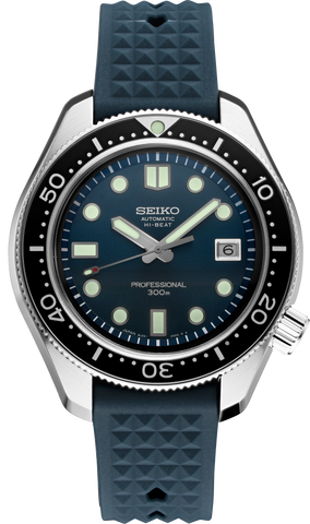 1968 Diver's Watch Recreation Limited Edition. Designed for those who treat life as the ultimate adventure, the Seiko Prospex line meets every challenge with technological excellence and style. Part of a rich legacy of innovation in high-intensity timekeeping, Prospex continues to celebrate a long history of sports watch excellence with recreations and reinterpretations of landmark achievements. Marking the 55th anniversary of Seiko's first diver's watch by recreating 1968's Hi-Beat, one-piece case, saturation diver, this extraordinary timepiece is available only in a limited edition of 1,100, with the serial number engraved on each caseback. Upgraded with a dual-curved anti-reflective sapphire crystal, it is crafted of Seiko's new Ever-Brilliant Steel, offering an exceptional level of corrosion resistance and a lighter, brighter finish. The rich blue-gray dial, designed to suggest the ocean depths at the point at which blue yields to darkness, features a date calendar and LumiBrite hands and markers. Following ISO standards for diving to depths of up to 300 meters, this saturation diver includes a black one-way rotating elapsed timing bezel, screwdown crown, and secure silicone strap, also in oceanic blue-gray. The proprietary hi-beat, 37-jewel, caliber 8L55 automatic movement, assembled expressly for diver's watches at the Shizukuishi Watch Studio, beats at a frequency of 36,000 vibrations per hour, with a power reserve of approximately 55 hours, and can be wound manually or automatically. 300m Water Resistant.