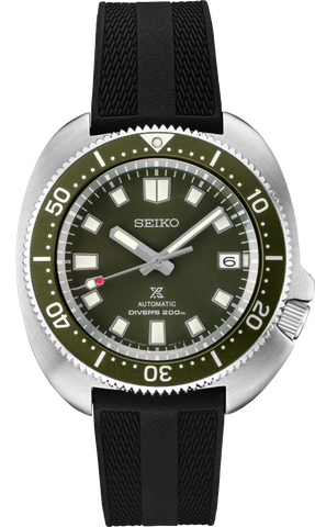 1970 Diver's Watch Reinterpretation. Designed for those who treat life as the ultimate adventure, the Seiko Prospex line meets every challenge with technological excellence and style. Part of a rich legacy of innovation in high-intensity timekeeping, Prospex continues to celebrate a long history of sports watch excellence with recreations and reinterpretations of landmark achievements. With contemporary styling and technology, this versatile timepiece reimagines Seiko's famed 1970 diver's watch, complete with the iconic case design that revolutionized underwater safety with a recessed crown creating a built-in crown guard at 4 o'clock. Sleeker and slimmer than the original, this masterfully updated design is crafted of stainless steel with super-hard coating, and includes a dual-curved anti-reflective sapphire crystal, green one-way rotating elapsed timing bezel, screwdown crown and caseback, and black silicone strap. The sporty green dial features a date calendar and LumiBrite hands and markers. Following ISO standards for scuba diving to depths of up to 200 meters, this exceptional watch can be wound manually or automatically and includes a 24-jewel automatic movement with a frequency of 21,600 vibrations per hour and a power reserve of approximately 70 hours. 200m Water Resistant.