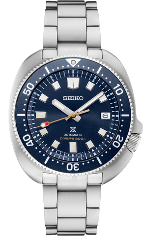 1970 Diver's Watch Reinterpretation Limited Edition. Designed for those who treat life as the ultimate adventure, the Seiko Prospex line meets every challenge with technological excellence and style. Part of a rich legacy of innovation in high-intensity timekeeping, Prospex continues to celebrate a long history of sports watch excellence with recreations and reinterpretations of landmark achievements. This extraordinary watch, available only in a limited edition of 5,500, with the serial number engraved on each caseback, continues a celebration of the 55th Anniversary of Seiko's first diver's watch with a reimagining of the famed 1970 model, complete with the iconic case design that revolutionized underwater safety with a recessed crown creating a built-in crown guard at 4 o'clock. With contemporary styling and technology, this masterfully updated design, sleeker and slimmer than the original, is crafted of stainless steel with super-hard coating, and includes a curved anti-reflective sapphire crystal, blue one-way rotating elapsed timing bezel, screwdown crown and caseback, and tri-fold push button release clasp with secure lock and extender, as well as an additional blue-gray silicone strap. The rich marine blue dial features a date calendar and LumiBrite hands and markers. Following ISO standards for scuba diving to depths of up to 200 meters, this exceptional watch can be wound manually or automatically and includes a 24-jewel automatic movement with a frequency of 21,600 vibrations per hour and a power reserve of approximately 70 hours. 200m Water Resistant