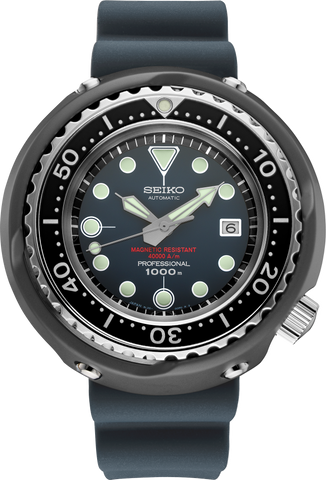 1975 Diver's Watch Recreation Limited Edition. Designed for those who treat life as the ultimate adventure, the Seiko Prospex line meets every challenge with technological excellence and style. Part of a rich legacy of innovation in high-intensity timekeeping, Prospex continues to celebrate a long history of sports watch excellence with recreations and reinterpretations of landmark achievements. Marking the 55th anniversary of Seiko's first diver's watch, this extraordinary 1,000 meter water resistant timepiece recreates the first watch designed to withstand the dangerous world of the professional diving, Seiko's 1975 saturation diver, with its one-piece inner case, outer shroud and revolutionary L-shaped protective gasket. The product of seven years of work by the Seiko engineering team, which generated 20 new technology patents, this landmark watch was inspired by a letter from a professional diver unable to find any watch equal to the demands of his job. Available only in a limited edition of 1,100, with the serial number engraved on each caseback, and crafted, like the original, with a light and durable one-piece titanium inner case and ceramic outer case, this limited edition includes a one-way rotating elapsed timing bezel in Seiko's new Ever-Brilliant Steel, offering an exceptional level of corrosion resistance and a lighter, brighter finish. The rich blue-gray dial, designed to suggest the ocean depths at the point at which blue yields to darkness, includes a date calendar and LumiBrite hands and markers, and is made of pure iron for antimagnetic resistance of 40,000A/m. With a sapphire crystal, screwdown crown, and blue-gray silicone strap, this exceptional watch, following ISO standards for diving to depths of up to 1,000 meters, features a 26-jewel caliber 8L35 automatic movement, assembled expressly for diver's watches at the Shizukuishi Watch Studio, and offering a frequency of 28,800 vibrations per hour, power reserve of approximately 50 hours, and manual or automatic winding. 1,000m Water Resistant.