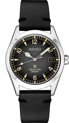1959 Sports Watch Reinterpretation. Designed for those who treat life as the ultimate adventure, the Seiko Prospex line meets every challenge with technological excellence and style. Part of a rich legacy of innovation in high-intensity timekeeping, Prospex continues to celebrate over 60 years of sports watch excellence with recreations and reinterpretations of landmark achievements. A modern reimagining of Seiko's first sport watch, introduced in 1959, this distinctive timepiece follows a highly successful Spring 2019 limited edition and more recent additions to the line. With a smaller case to fit contemporary tastes while evoking a vintage feel, this versatile watch features a gradated black dial with date calendar and LumiBrite hands and markers, as well as a curved anti-reflective sapphire crystal. The 24-jewel automatic movement beats at a frequency of 21,600 vibrations per hour, with a power reserve of approximately 70 hours, and can be wound manually or automatically. Crafted of stainless steel, with screwdown crown, see-through caseback, gray leather strap and tri-fold push button release clasp. 20 bar, 200M Water Resistant
