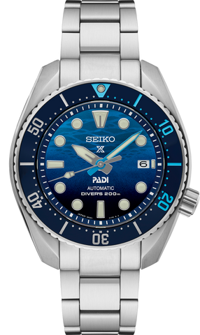 Prospex PADI Special Edition Special edition celebrating the partnership between Seiko Prospex and PADI, the world’s leading scuba diver training organization Patterned and gradated blue dial reflecting the surface of the ocean as seen from under water as the sunlight reaches through the waves on the surface Automatic with manual winding capability Blue ceramic uni-directional rotating elapsed timing bezel with vivid blue accents Date calendar LumiBrite hands and markers Screwdown crown and caseback Tri-fold push button release clasp with secure lock and extender