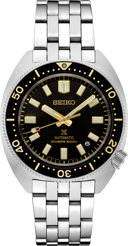 Prospex Automatic Diver's Watch Re-Interpretation. Designed for those who treat life as the ultimate adventure, the Seiko Prospex line meets every challenge with technological excellence and style. Part of a rich legacy of innovation in high-intensity timekeeping, Prospex continues to celebrate a long history of sports watch excellence with recreations and reinterpretations of landmark achievements. With the thinnest case to date of any Seiko automatic diver's watch, as well as an elegant, yet sporty five-row bracelet, this sleekly updated timepiece incorporates the distinctive cushion-shape and recessed crown of one of Seiko's most iconic designs. Crafted of stainless steel with super hard coating, this versatile watch includes a curved sapphire crystal with anti-reflective coating on the inner surface, black uni-directional rotating elapsed timing bezel, screwdown crown and caseback, and a newly developed compact tri-fold clasp with secure lock and extender. The rich black dial features gold accents, a date calendar and LumiBrite hands and markers. Following ISO standards for scuba diving to depths of up to 200 meters, this exceptional timepiece offers manual winding capability and includes a 24-jewel automatic movement with a frequency of 21,600 vibrations per hour and a power reserve of approximately 70 hours. 200m Water Resistant