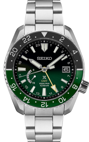Prospex LX GMT U.S. Special Edition Available exclusively in the U.S. market Inspired by the green aurora effect visible around the earth’s polar regions from space Spring drive GMT Automatic with manual winding capability Black and green sapphire GMT bezel marked in 24 one-hour increments Gradated black to green sunray dial Power reserve indicator Date calendar LumiBrite hands and markers Yellow GMT hand Screwdown crown and caseback Tri-fold push-button release clasp