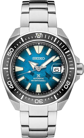 Prospex Special Edition Automatic Diver. Designed for those who treat life as the ultimate adventure, the Seiko Prospex line meets every challenge with technological excellence and winning design. Inspired by Seiko's most iconic diving styles, this distinctive Special Edition evokes the world view of a manta ray with the gradated blue of the dial suggesting the variations in sunlight as it penetrates deep into the ocean, heightened by a stamped pattern suggesting waves. For reliable timing in rough waters, the 23-jewel automatic movement beats at a frequency of 21,600 vibrations per hour, with a power reserve of approximately 41 hours, and can be wound manually or automatically. With magnified date calendar and LumiBrite hands and markers, the dial is framed by a black ceramic one-way rotating elapsed timing bezel. This high-intensity timepiece, in stainless steel, with secure screwdown crown and caseback, and anti-reflective sapphire crystal, follows ISO standards for scuba diving. 200m Water Resistant