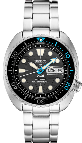 Prospex PADI Special Edition Black deep 3-D pressed pattern dial Automatic diver with manual winding capability Black ceramic uni-directional rotating elapsed timing bezel with bright blue accents Magnified day/date calendar LumiBrite hands and markers Screwdown crown and caseback Tri-fold push button release clasp with secure lock and extender Special Edition celebrating the partnership between Seiko Prospex and PADI, the world's leading scuba diver training organization