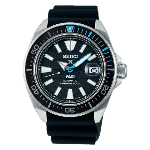 Prospex PADI Special Edition Black deep 3-D pressed pattern dial Automatic diver with manual winding capability Black ceramic uni-directional rotating elapsed timing bezel with bright blue accents Magnified date calendar LumiBrite hands and markers Screwdown crown and caseback Special Edition celebrating the partnership between Seiko Prospex and PADI, the world's leading scuba diver training organization