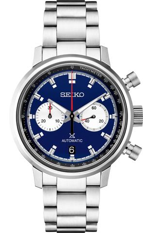 Prospex Speedtimer Mechanical Chronograph Inspired by Seiko's first precision chronographs, developed for international sporting competitions in 1964, and its 1969 introduction of "Speedtimer," the world's first automatic self-winding chronograph Automatic with manual winding capability Chronograph measures up to 30 minutes of elapsed time in 1/8-second increments Column wheel and vertical clutch mechanism allows for smooth, stutter-free movement of the chronograph hand while providing longer wear and efficiency, and maintaining the power reserve better during chronograph operation Blue dial with red and white accents inspired by the original "Speedtimer" colors LumiBrite hands and markers Specially designed pushers and crown for ease of use Screwdown see-through caseback Tri-fold push button release clasp Packaged in a special collectors' box