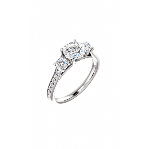 Show your partner how deep your love extends with this glamorous three stone engagement ring from Stuller. This multipurpose engagement ring has heirloom embellishments with a contemporary design. Made from high-end 14k white gold, this keepsake can withstand normal wear and tear for decades. With detailed metalwork in this ring's build, this engagement ring is a beautiful representation of your lasting commitment. A fitting setting cushions your center stone from abrasions, helping to give any stone a distinct shimmer and shine. Azzi Jewelers in Ingham County are dedicated to offering customers with a variety of engagement jewelry from the world’s foremost brands. Reach out to us above online or over the phone, or stop by to see this piece in person.