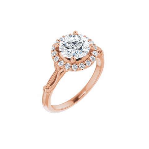 Show your partner how deep your love extends with this flawless halo engagement ring from Stuller. This timeless engagement ring contains heirloom embellishments with a contemporary design. Made from high-end 14k rose gold, this engagement ring can withstand normal wear and tear for decades. With expert metalwork in this ring's build, this band is a stunning representation of your commitment. A protective setting guards your center stone from damage, helping to give any stone shimmer and shine. Azzi Jewelers are dedicated to supplying customers with a variety of luxury jewelry from today’s major brands. Reach out to us above online or over the phone, or stop by to see this piece in person.
