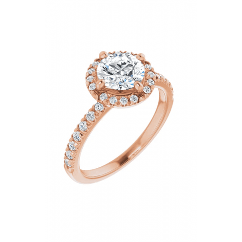 Make your proposal one for the ages with this impeccable halo engagement ring from Stuller. This versatile engagement ring contains heirloom embellishments with a trendy design. Made from high-end 14k rose gold, this keepsake will retain its original luster for ages. With expert metalwork in this ring's build, this engagement ring is a stunning representation of your commitment. A protective setting guards your center stone from damage, helping to give any stone shimmer and shine. Azzi Jewelers are committed to providing customers with a range of luxury jewelry from today’s foremost brands. Reach out to us above online or over the phone, or stop by to see this piece in person.