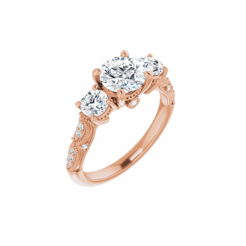 Show your partner how deep your love extends with this impeccable three stone engagement ring from Stuller. This timeless engagement ring features heirloom embellishments with a modern design. Made from high-quality 14k rose gold, this keepsake will last for many years to come. With detailed metalwork in this ring's build, this band is a stunning representation of your lasting commitment. A fitting setting guards your center stone from blemishes, helping to give any stone unmatched shimmer and shine. Azzi Jewelers are dedicated to offering customers with a plethora of bridal jewelry from the world’s foremost brands. Reach out to us above online or over the phone, or stop by to see this piece in person.